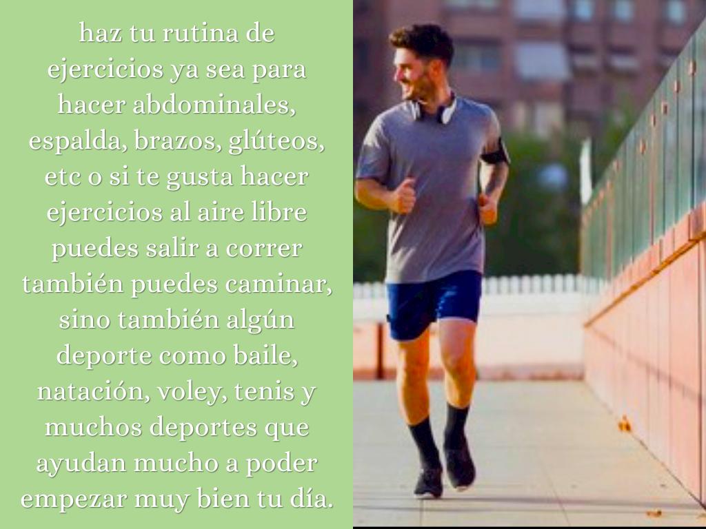 haz tu rutina de ejercicios ya sea para hacer abdominales, espalda, brazos, glúteos, etc o si te gusta hacer ejercicios al aire libre puedes salir a correr también puedes caminar, sino también algún deporte como baile, natación, voley, tenis y muchos deportes que ayudan mucho a poder empezar muy bien tu día.
