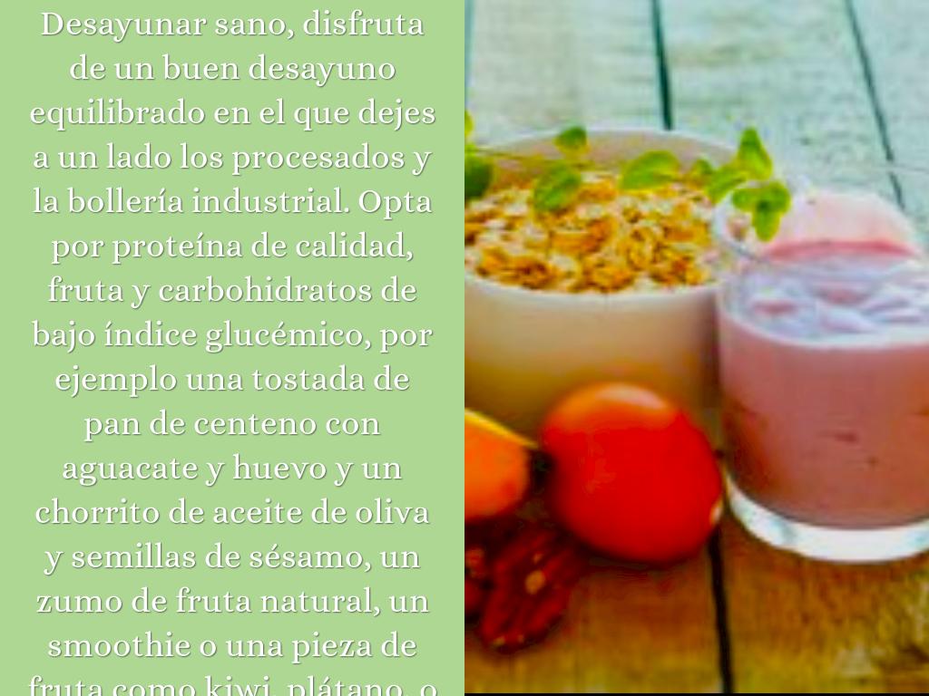 Desayunar sano, disfruta de un buen desayuno equilibrado en el que dejes a un lado los procesados y la bollería industrial. Opta por proteína de calidad, fruta y carbohidratos de bajo índice glucémico, por ejemplo una tostada de pan de centeno con aguacate y huevo y un chorrito de aceite de oliva y semillas de sésamo, un zumo de fruta natural, un smoothie o una pieza de fruta como kiwi, plátano, o naranja, café o infusión.