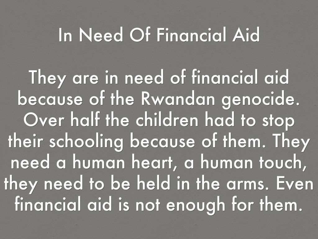 They are in need of financial aid because of the Rwandan genocide. Over half the children had to stop their schooling because of them. They need a human heart, a human touch, they need to be held in the arms. Even financial aid is not enough for them.