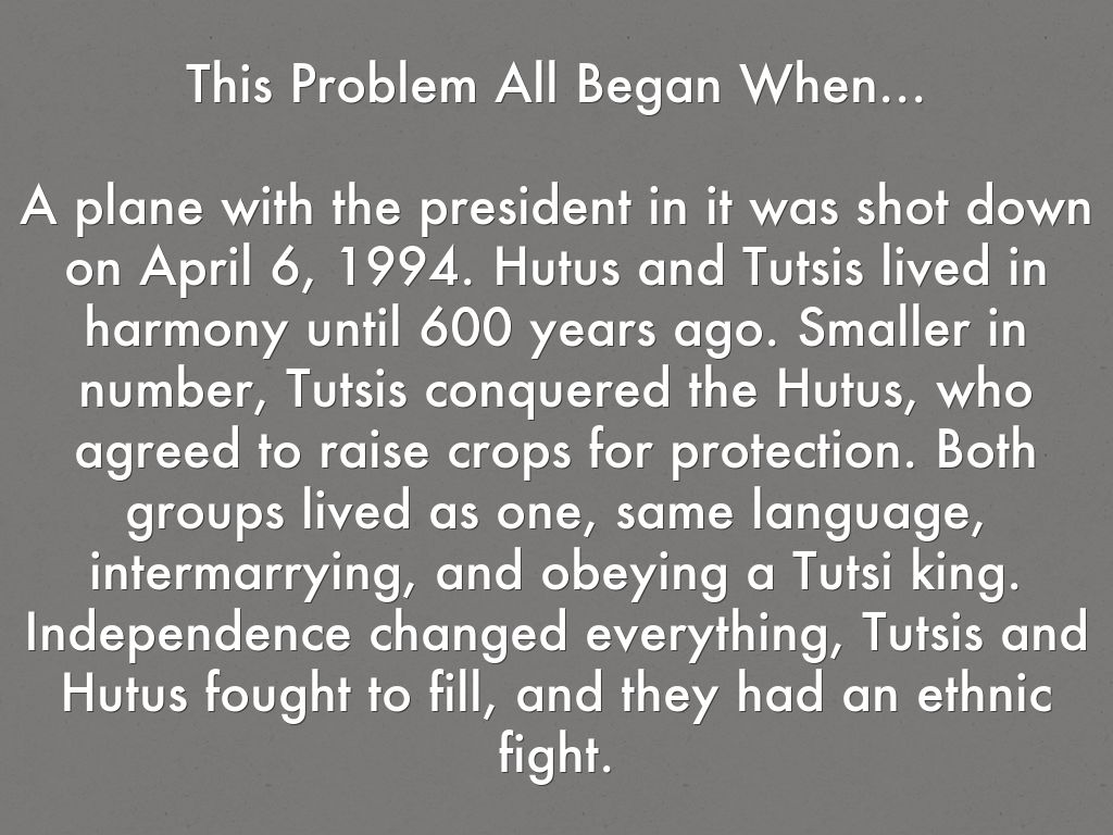 A plane with the president in it was shot down on April 6, 1994. Hutus and Tutsis lived in harmony until 600 years ago. Smaller in number, Tutsis conquered the Hutus, who agreed to raise crops for protection. Both groups lived as one, same language, intermarrying, and obeying a Tutsi king. Independence changed everything, Tutsis and Hutus fought to fill, and they had an ethnic fight.