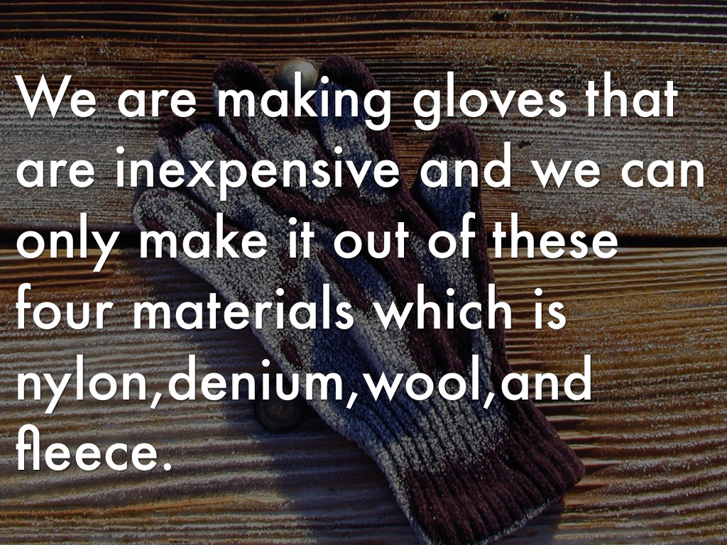 We are making gloves that are inexpensive and we can only make it out of these four materials which is nylon,denium,wool,and fleece.