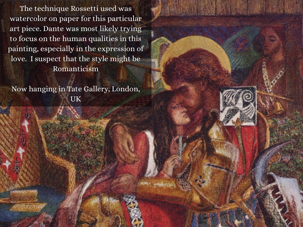 The technique Rossetti used was watercolor on paper for this particular art piece. Dante was most likely trying to focus on the human qualities in this painting, especially in the expression of love. I suspect that the style might be Romanticism