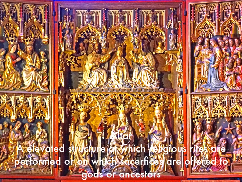 A elevated structure at which religious rites are performed or on which sacerfices are offered to gods or ancestors