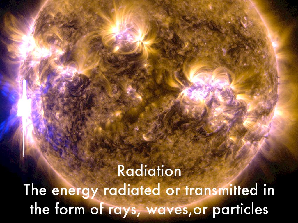 The energy radiated or transmitted in the form of rays, waves,or particles