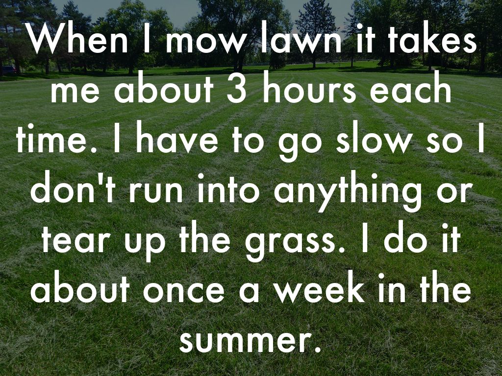 When I mow lawn it takes me about 3 hours each time. I have to go slow so I don't run into anything or tear up the grass. I do it about once a week in the summer.