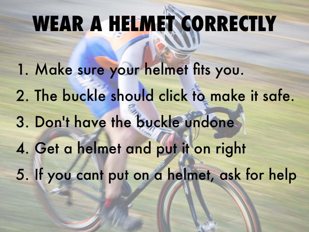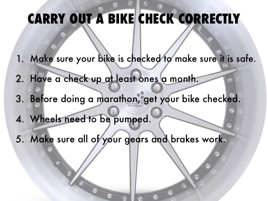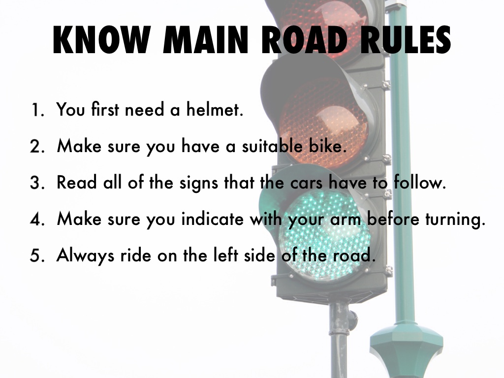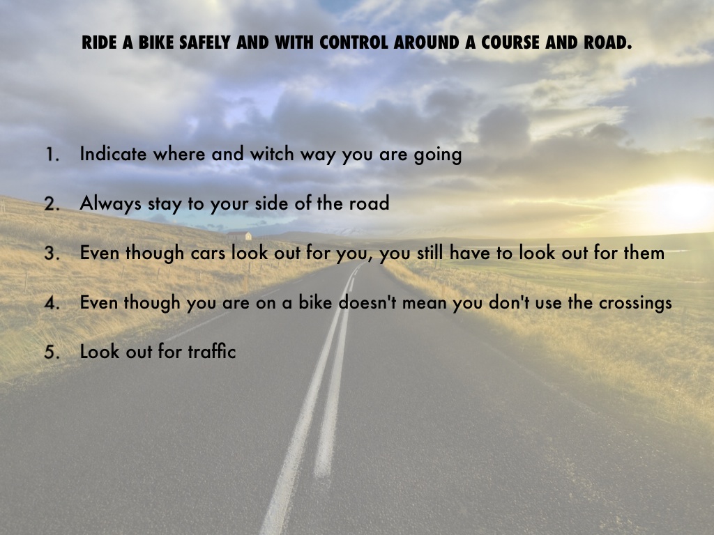 1.Know main road rules 2.Read and understand road signs 3.Identify and anticipate hazards 4.Wear a helmet correctly 5.Carry out a bike check correctly 6.Ride a bike safely and with control around a course (and on the road) 7.Know what clothing to wear.