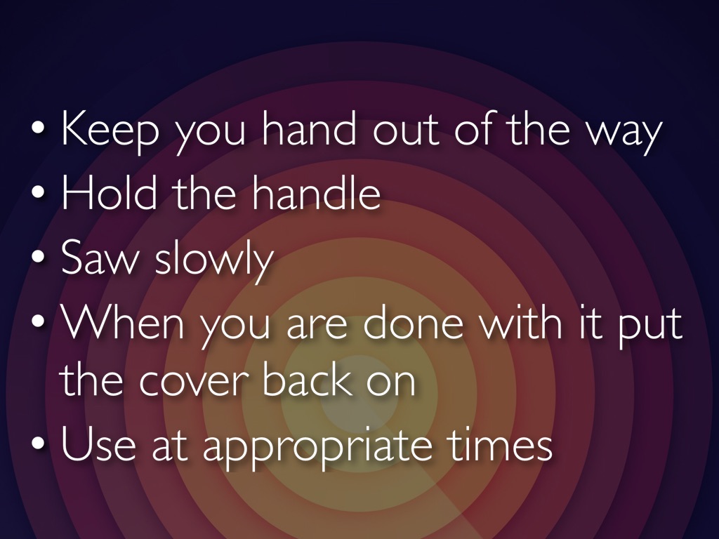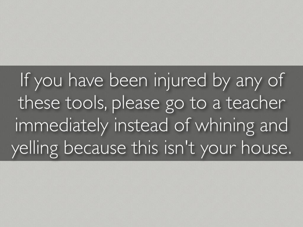 If you have been injured by any of these tools, please go to a teacher immediately instead of whining and yelling because this isn't your house.