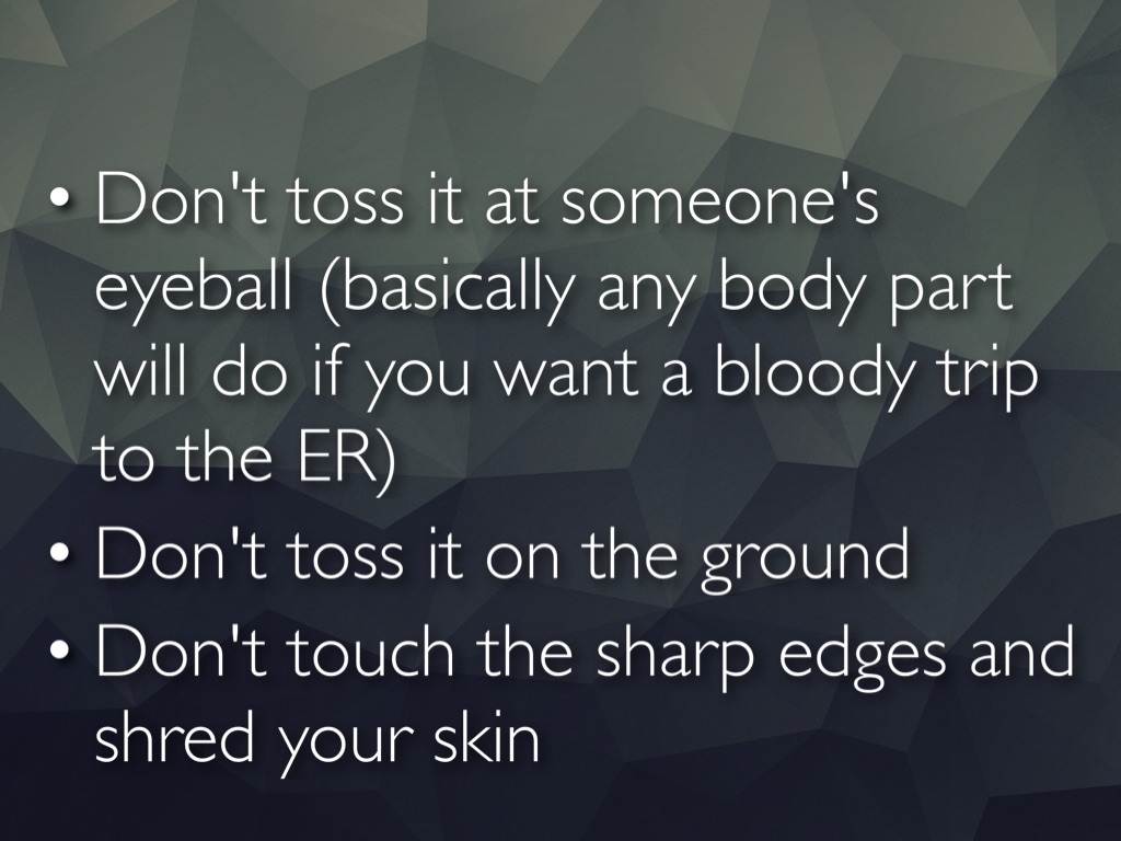 Don't toss it at someone's eyeball (basically any body part will do if you want a bloody trip to the ER)