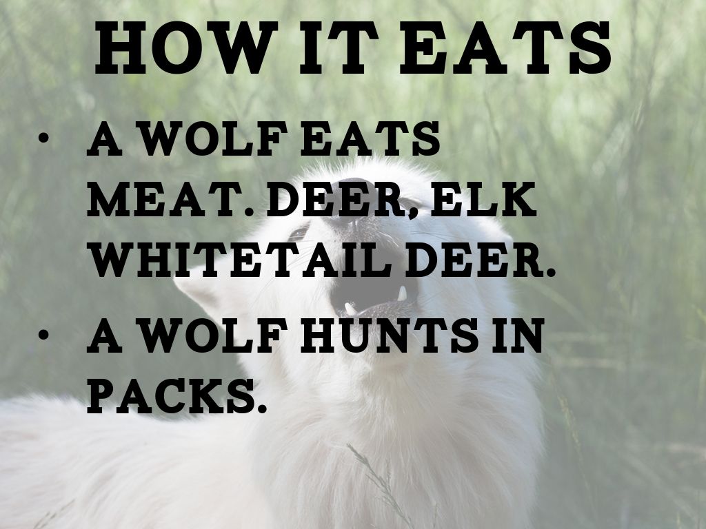 A wolf eats meat. Deer, elk whitetail deer.