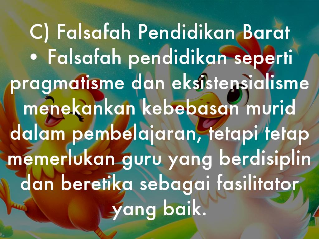 • Falsafah pendidikan seperti pragmatisme dan eksistensialisme menekankan kebebasan murid dalam pembelajaran, tetapi tetap memerlukan guru yang berdisiplin dan beretika sebagai fasilitator yang baik.