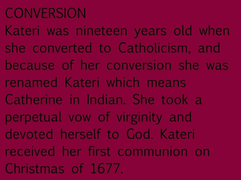 Kateri was nineteen years old when she converted to Catholicism, and because of her conversion she was renamed Kateri which means Catherine in Indian. She took a perpetual vow of virginity and devoted herself to God. Kateri received her first communion on Christmas of 1677.