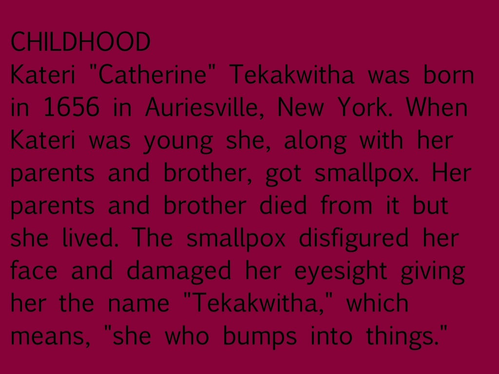 Kateri "Catherine" Tekakwitha was born in 1656 in Auriesville, New York. When Kateri was young she, along with her parents and brother, got smallpox. Her parents and brother died from it but she lived. The smallpox disfigured her face and damaged her eyesight giving her the name "Tekakwitha," which means, "she who bumps into things."
