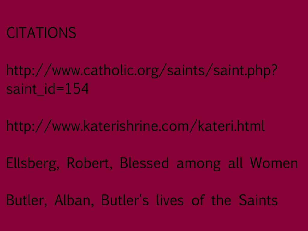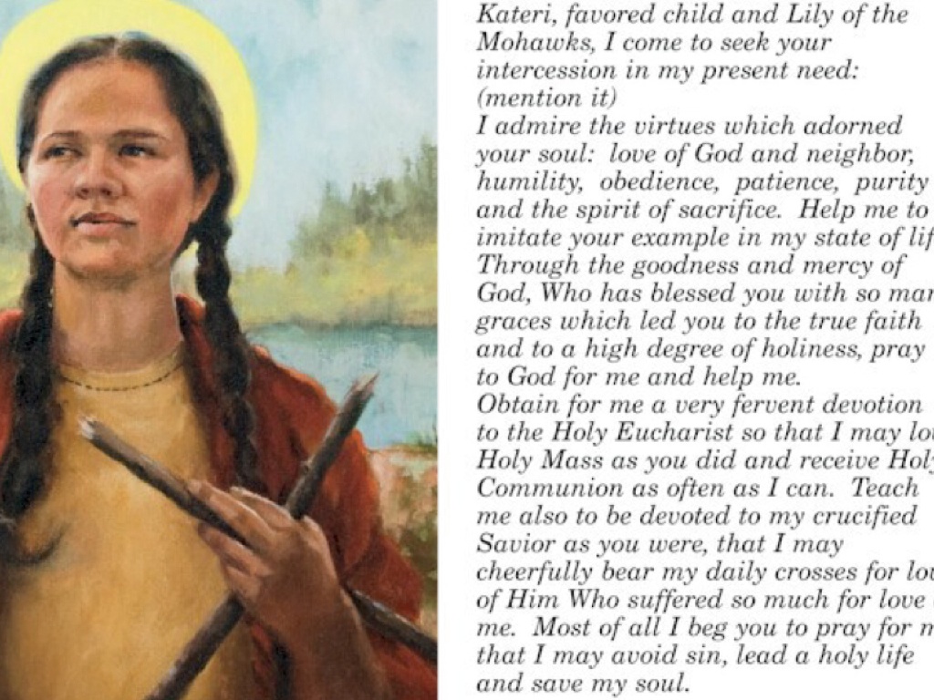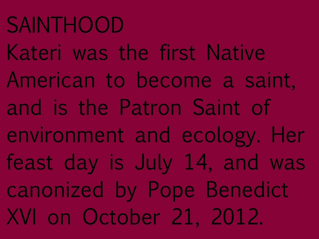 Kateri was the first Native American to become a saint, and is the Patron Saint of environment and ecology. Her feast day is July 14, and was canonized by Pope Benedict XVI on October 21, 2012.
