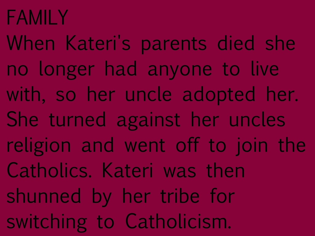 When Kateri's parents died she no longer had anyone to live with, so her uncle adopted her. She turned against her uncles religion and went off to join the Catholics. Kateri was then shunned by her tribe for switching to Catholicism.