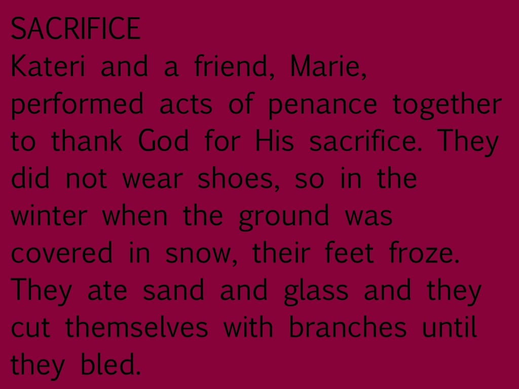 Kateri and a friend, Marie, performed acts of penance together to thank God for His sacrifice. They did not wear shoes, so in the winter when the ground was covered in snow, their feet froze. They ate sand and glass and they cut themselves with branches until they bled.