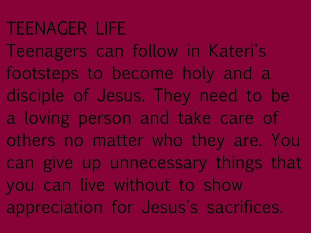 Teenagers can follow in Kateri's footsteps to become holy and a disciple of Jesus. They need to be a loving person and take care of others no matter who they are. You can give up unnecessary things that you can live without to show appreciation for Jesus's sacrifices.
