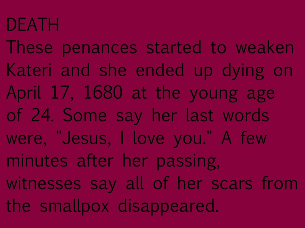 These penances started to weaken Kateri and she ended up dying on April 17, 1680 at the young age of 24. Some say her last words were, "Jesus, I love you." A few minutes after her passing, witnesses say all of her scars from the smallpox disappeared.