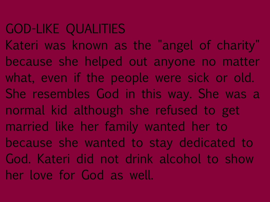 Kateri was known as the "angel of charity" because she helped out anyone no matter what, even if the people were sick or old. She resembles God in this way. She was a normal kid although she refused to get married like her family wanted her to because she wanted to stay dedicated to God. Kateri did not drink alcohol to show her love for God as well.