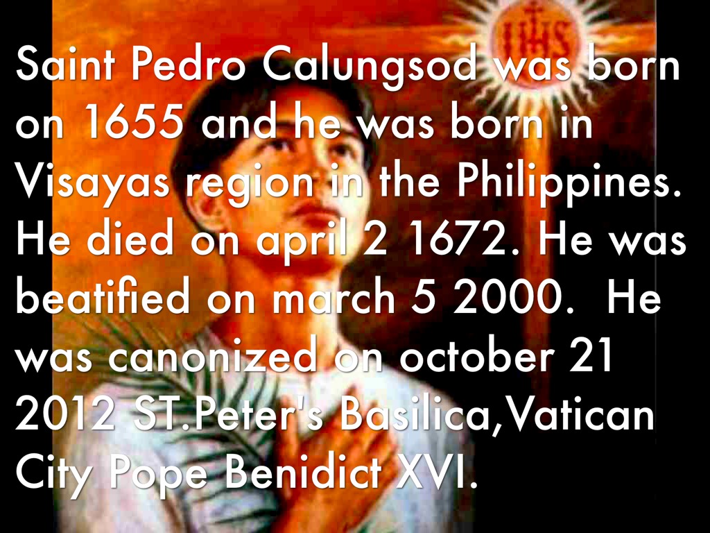 Saint Pedro Calungsod was born on 1655 and he was born in Visayas region in the Philippines. He died on april 2 1672. He was beatified on march 5 2000. He was canonized on october 21 2012 ST.Peter's Basilica,Vatican City Pope Benidict XVI.