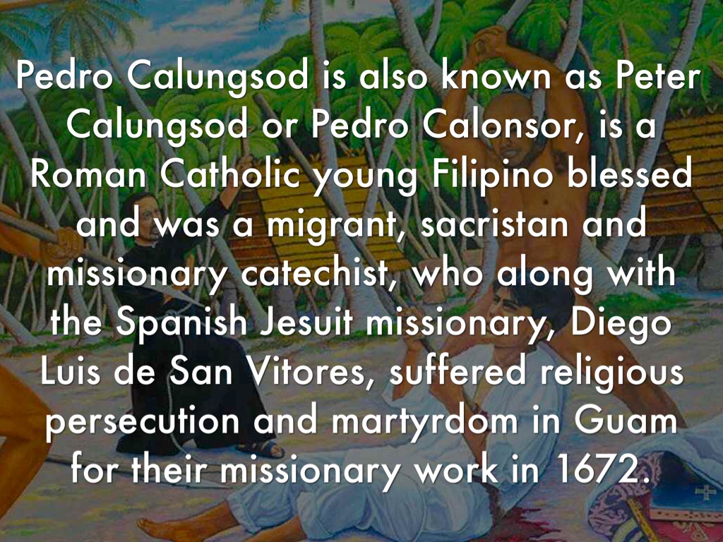 Pedro Calungsod is also known as Peter Calungsod or Pedro Calonsor, is a Roman Catholic young Filipino blessed and was a migrant, sacristan and missionary catechist, who along with the Spanish Jesuit missionary, Diego Luis de San Vitores, suffered religious persecution and martyrdom in Guam for their missionary work in 1672.