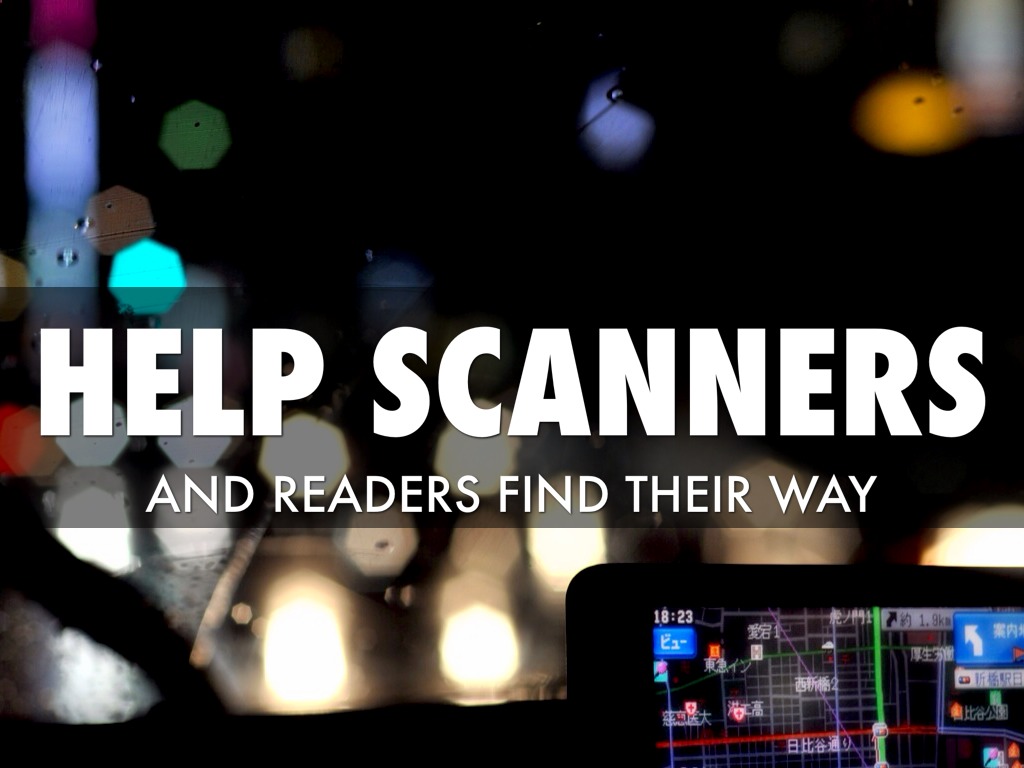 Using sections, sub headlines, dividers all help those scanning the text to find their way and stop to read.