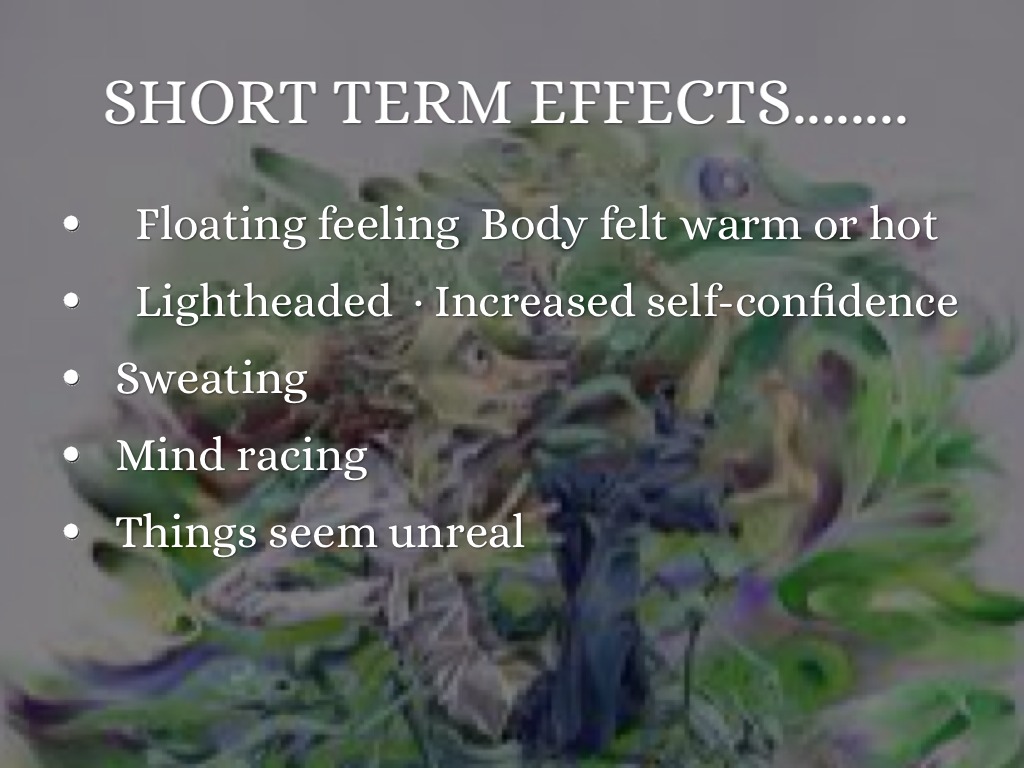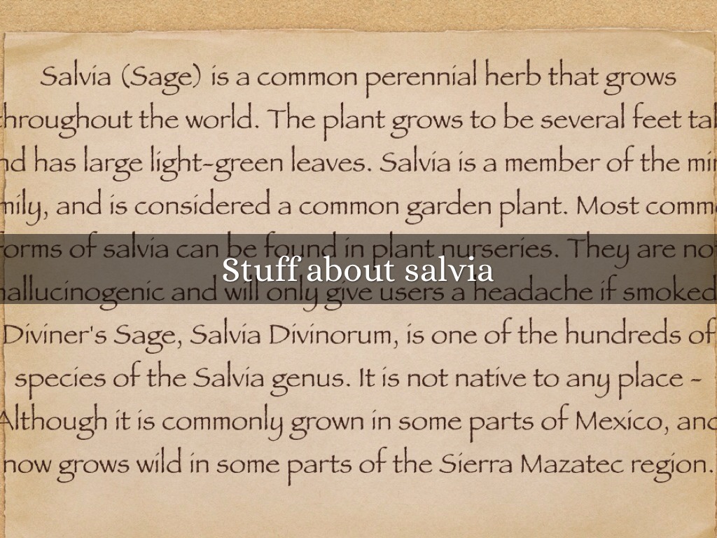 At very low dosages, Salvia can act as an antidepressant. Low dosages often yield "interesting" experiences. In larger dosages, the person fully loses control over mind and body, does not percieve anything or anybody like they really are, and can start violently trash about or run out of the house and underneath a car. People who have experienced this generally never want to use Salvia again.