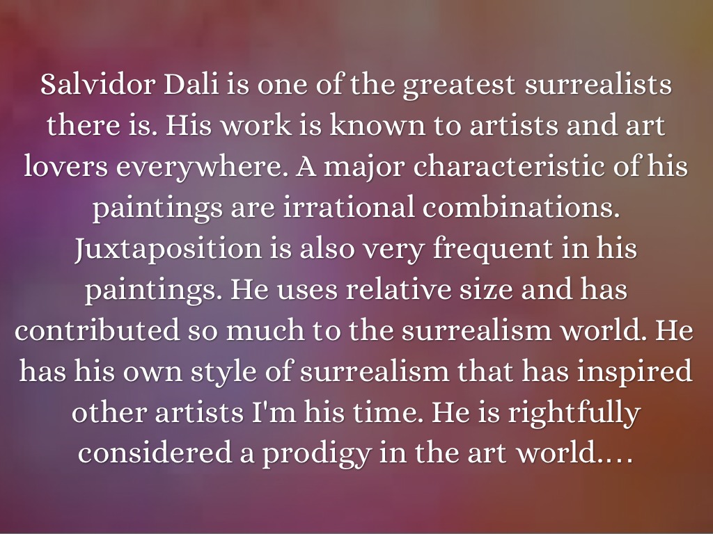 Salvidor Dali is one of the greatest surrealists there is. His work is known to artists and art lovers everywhere. A major characteristic of his paintings are irrational combinations. Juxtaposition is also very frequent in his paintings. He uses relative size and has contributed so much to the surrealism world. He has his own style of surrealism that has inspired other artists I'm his time. He is rightfully considered a prodigy in the art world.