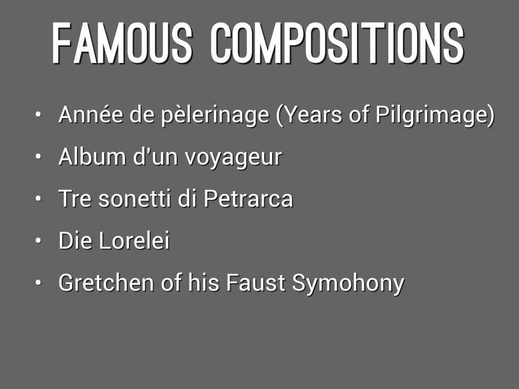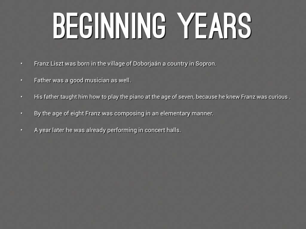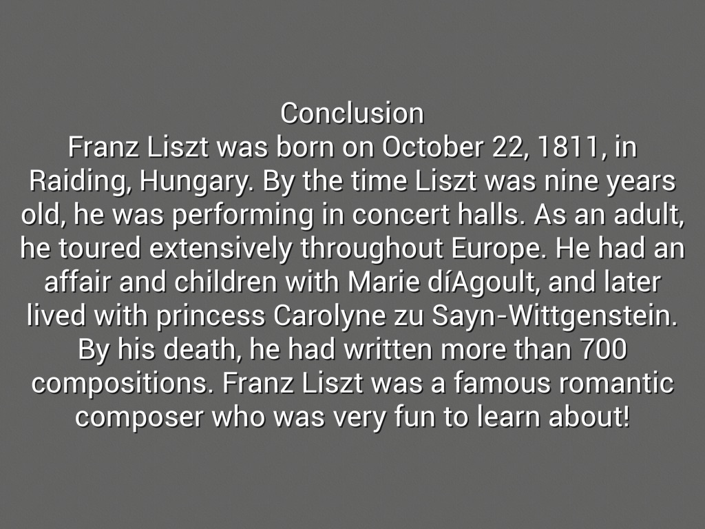 Franz Liszt was born on October 22, 1811, in Raiding, Hungary. By the time Liszt was nine years old, he was performing in concert halls. As an adult, he toured extensively throughout Europe. He had an affair and children with Marie díAgoult, and later lived with princess Carolyne zu Sayn-Wittgenstein. By his death, he had written more than 700 compositions. Franz Liszt was a famous romantic composer who was very fun to learn about!