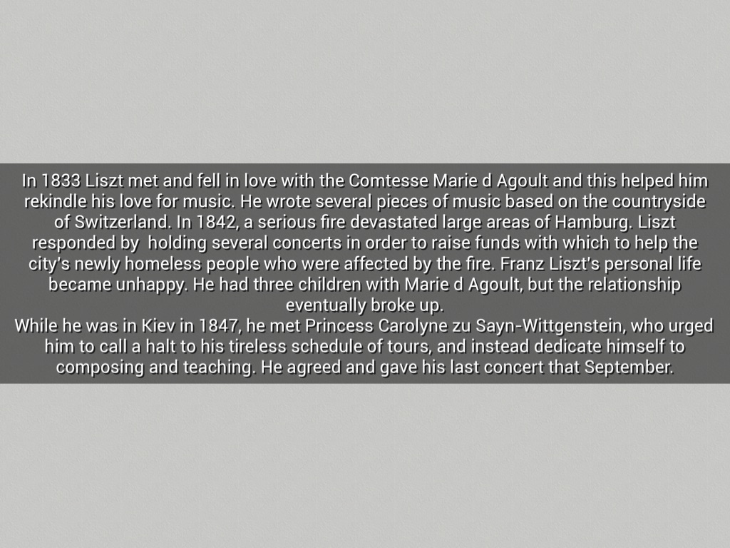 In 1833 Liszt met and fell in love with the Comtesse Marie d Agoult and this helped him rekindle his love for music. He wrote several pieces of music based on the countryside of Switzerland. In 1842, a serious fire devastated large areas of Hamburg. Liszt responded by holding several concerts in order to raise funds with which to help the city's newly homeless people who were affected by the fire. Franz Liszt's personal life became unhappy. He had three children with Marie d Agoult, but the relationship eventually broke up.