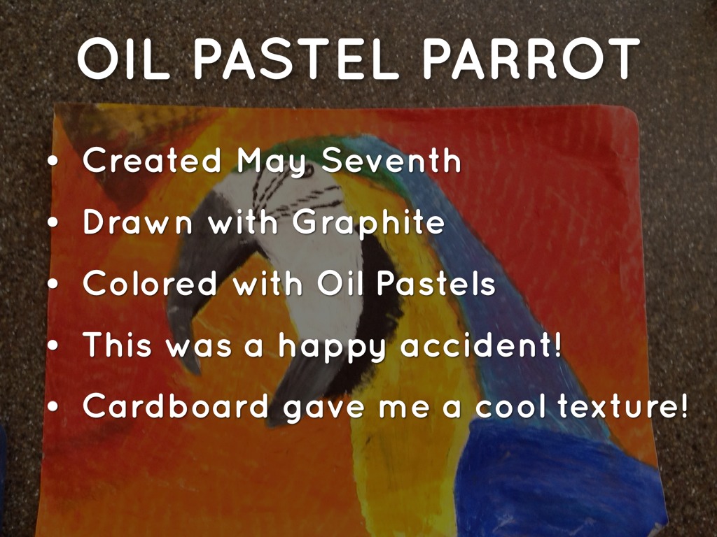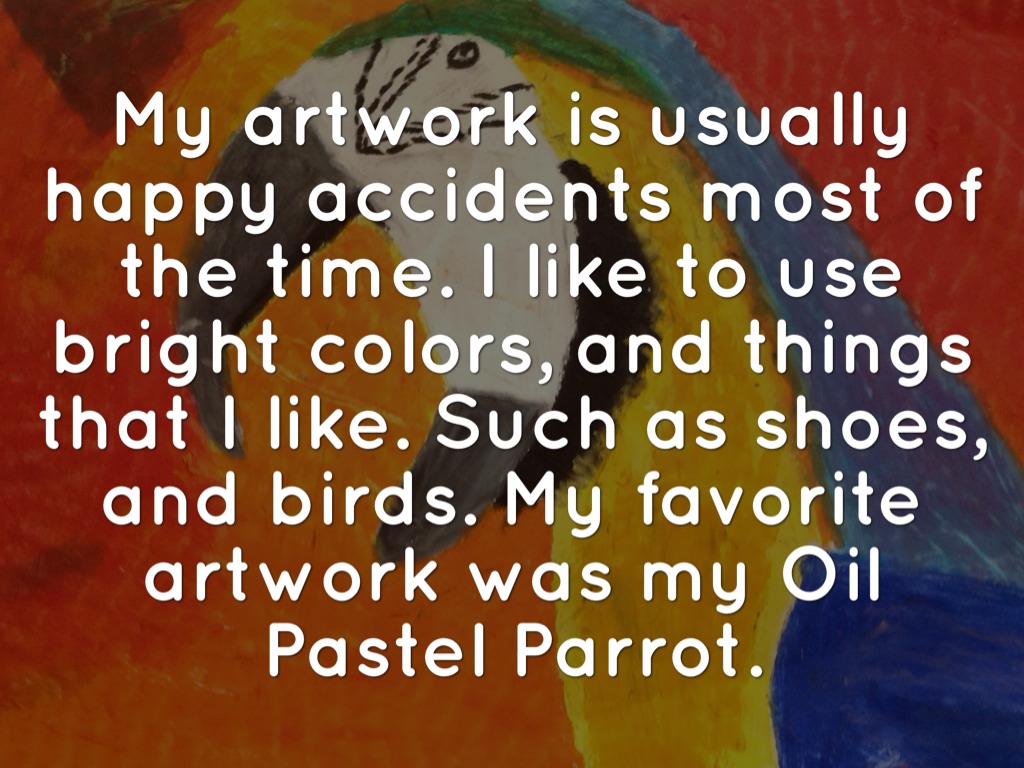 My artwork is usually happy accidents most of the time. I like to use bright colors, and things that I like. Such as shoes, and birds. My favorite artwork was my Oil Pastel Parrot.