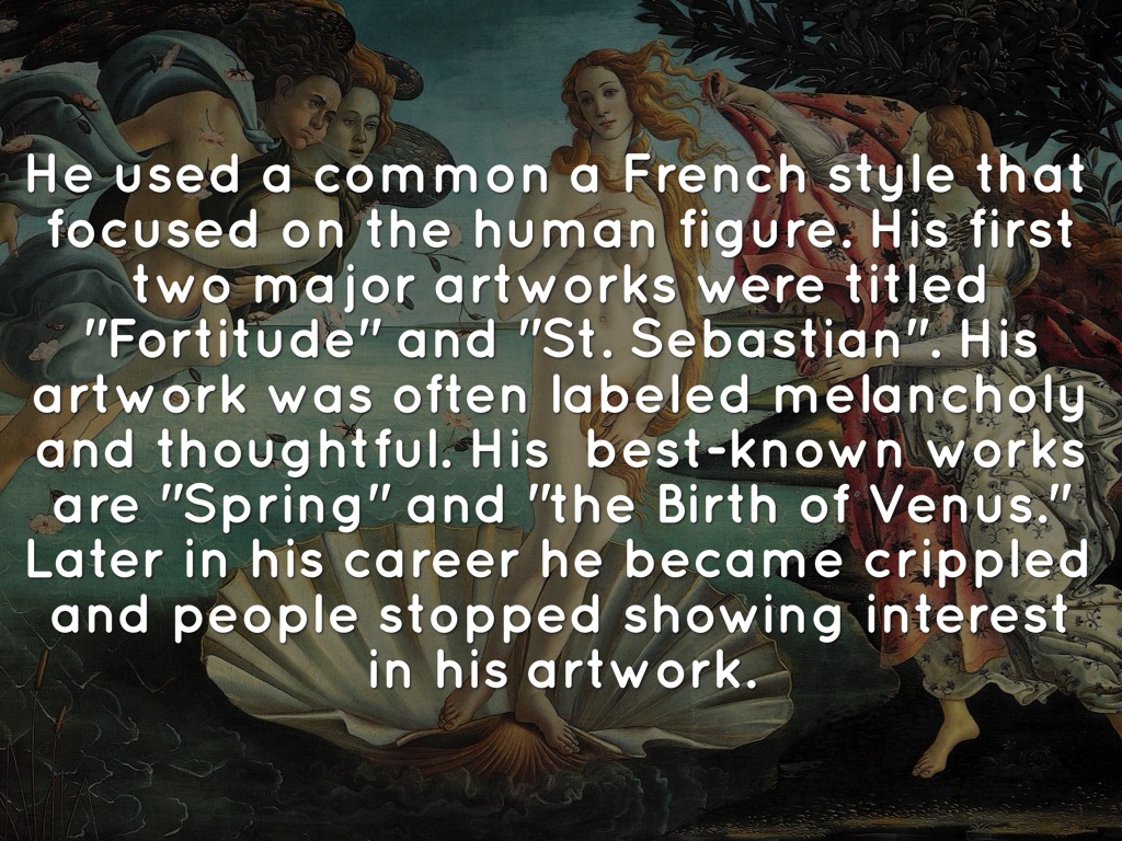 He used a common a French style that focused on the human figure. His first two major artworks were titled "Fortitude" and "St. Sebastian". His artwork was often labeled melancholy and thoughtful. His best-known works are "Spring" and "the Birth of Venus." Later in his career he became crippled and people stopped showing interest in his artwork.