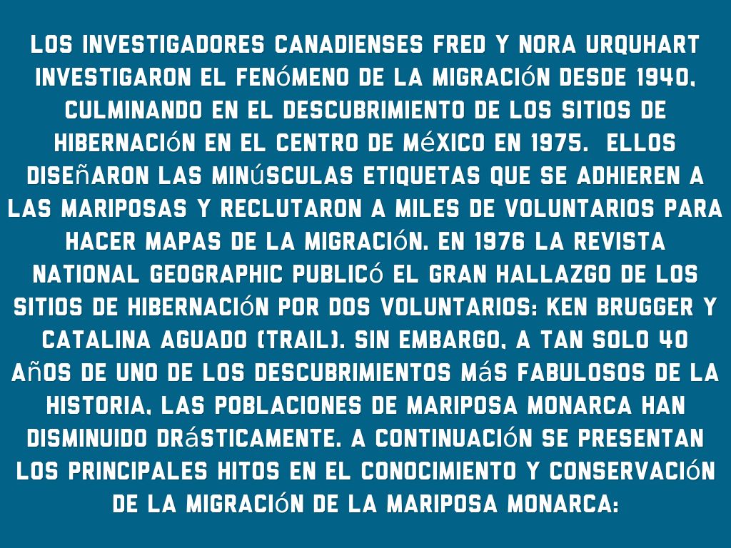 Los investigadores canadienses Fred y Nora Urquhart investigaron el fenómeno de la migración desde 1940, culminando en el descubrimiento de los sitios de hibernación en el centro de México en 1975. Ellos diseñaron las minúsculas etiquetas que se adhieren a las mariposas y reclutaron a miles de voluntarios para hacer mapas de la migración. En 1976 la revista National Geographic publicó el gran hallazgo de los sitios de hibernación por dos voluntarios: Ken Brugger y Catalina Aguado (Trail). Sin embargo, a tan solo 40 años de uno de los descubrimientos más fabulosos de la historia, las poblaciones de mariposa Monarca han disminuido drásticamente. A continuación se presentan los principales hitos en el conocimiento y conservación de la migración de la mariposa Monarca: