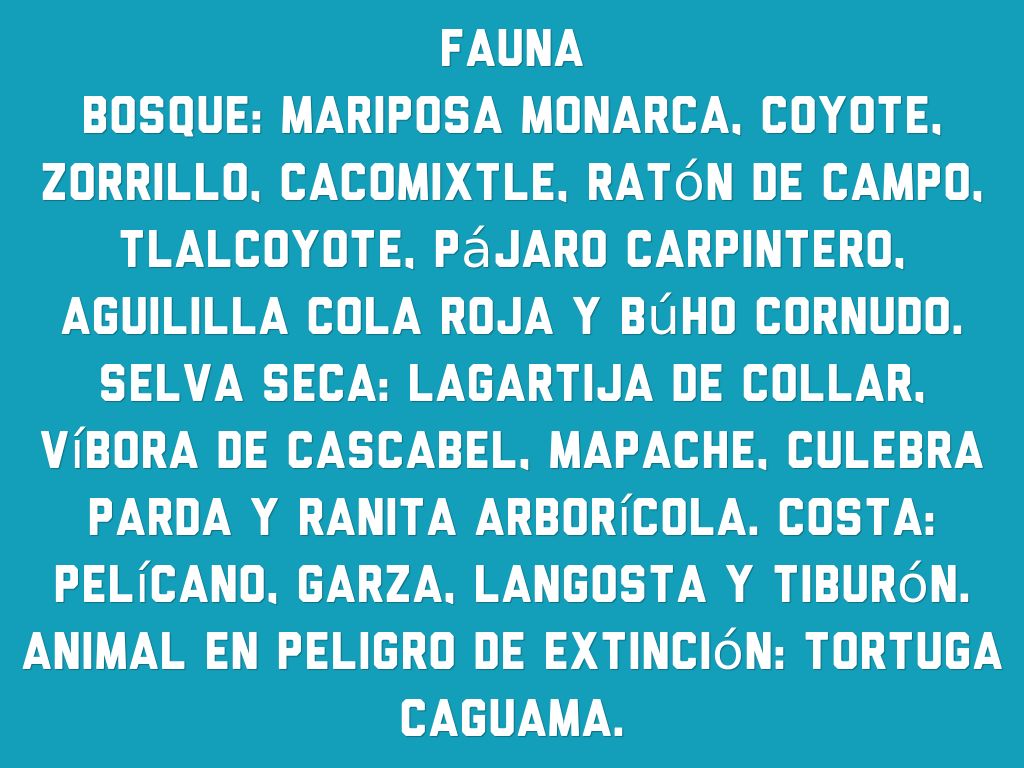 Bosque: mariposa monarca, coyote, zorrillo, cacomixtle, ratón de campo, tlalcoyote, pájaro carpintero, aguililla cola roja y búho cornudo. Selva seca: lagartija de collar, víbora de cascabel, mapache, culebra parda y ranita arborícola. Costa: pelícano, garza, langosta y tiburón. Animal en peligro de extinción: tortuga caguama.