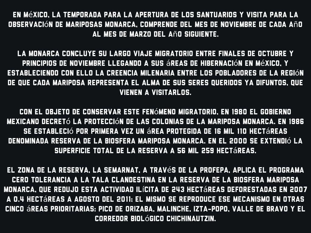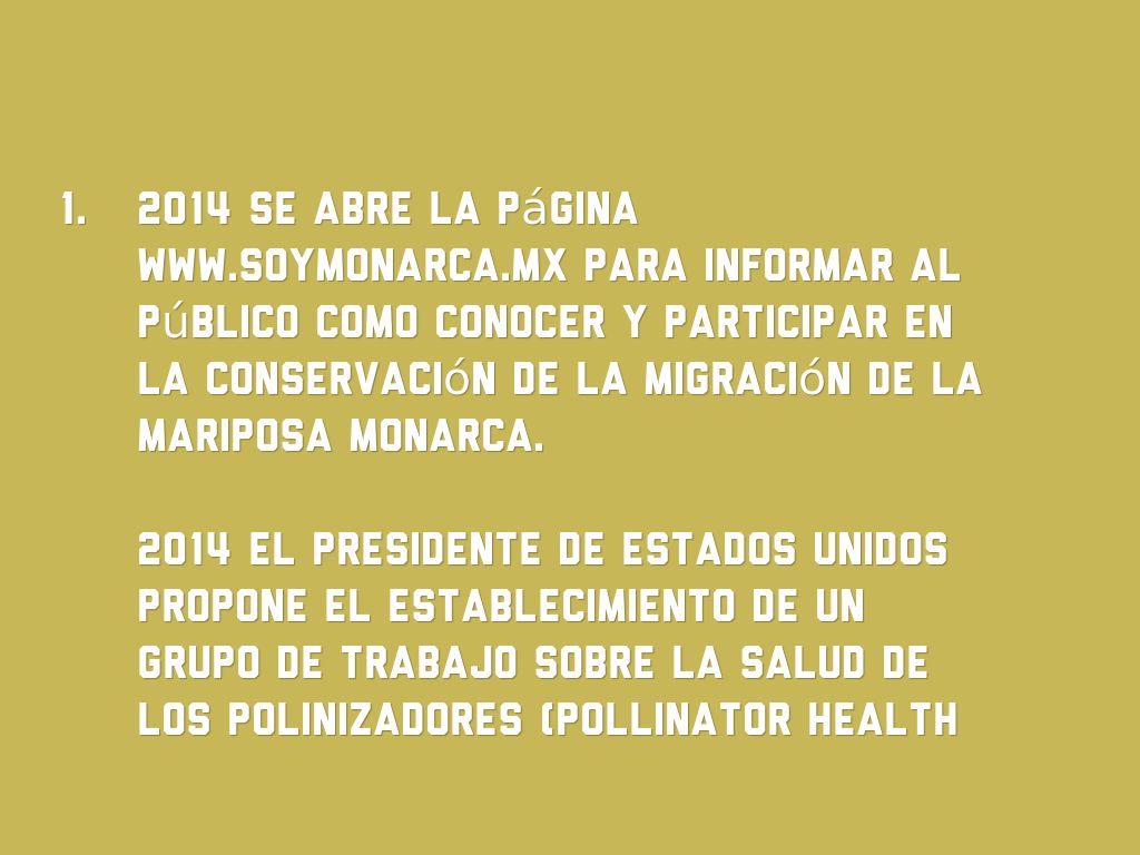 - 2014 Se abre la página www.soymonarca.mx para informar al público como conocer y participar en la conservación de la migración de la mariposa Monarca.