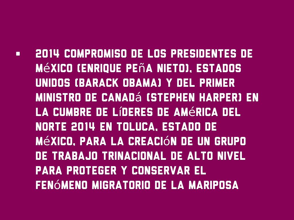 - 2014 Compromiso de los presidentes de México (Enrique Peña Nieto), Estados Unidos (Barack Obama) y del primer ministro de Canadá (Stephen Harper) en la Cumbre de Líderes de América del Norte 2014 en Toluca, Estado de México, para la creación de un Grupo de Trabajo Trinacional de Alto Nivel para proteger y conservar el fenómeno migratorio de la mariposa Monarca (19 de febrero) que simboliza la unión de las tres naciones.