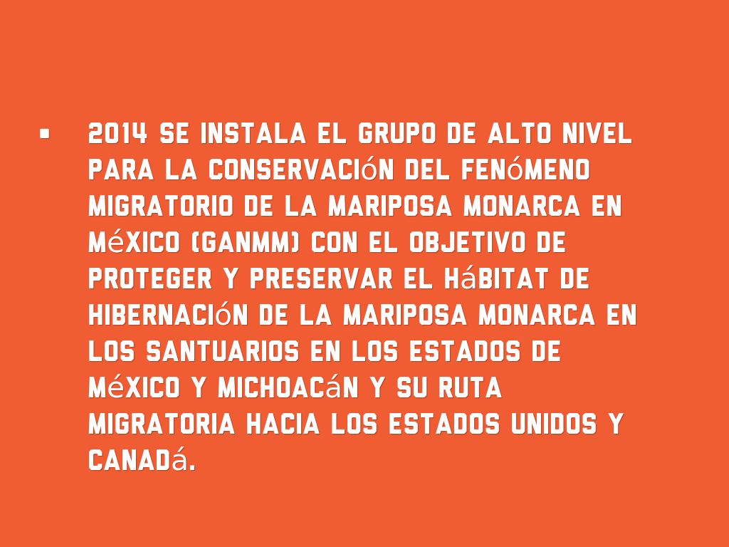 - 2014 Se instala el Grupo de Alto Nivel para la Conservación del Fenómeno Migratorio de la Mariposa Monarca en México (GANMM) con el objetivo de Proteger y preservar el hábitat de hibernación de la Mariposa Monarca en los Santuarios en los Estados de México y Michoacán y su ruta migratoria hacia los Estados Unidos y Canadá.