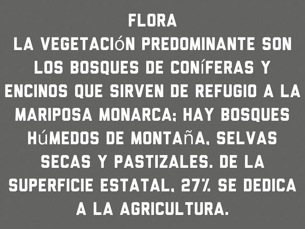 La vegetación predominante son los bosques de coníferas y encinos que sirven de refugio a la mariposa monarca; hay bosques húmedos de montaña, selvas secas y pastizales. De la superficie estatal, 27% se dedica a la agricultura.