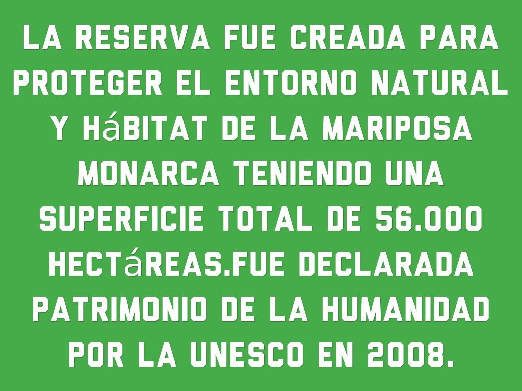 La reserva fue creada para proteger el entorno natural y hábitat de la mariposa monarca teniendo una superficie total de 56.000 hectáreas.Fue declarada Patrimonio de la Humanidad por la Unesco en 2008.