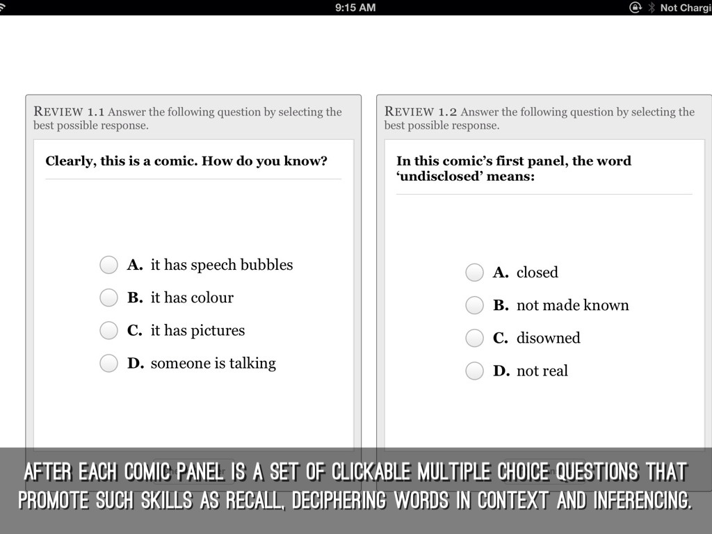 AFTER EACH COMIC PANEL IS A SET OF CLICKABLE MULTIPLE CHOICE QUESTIONS THAT