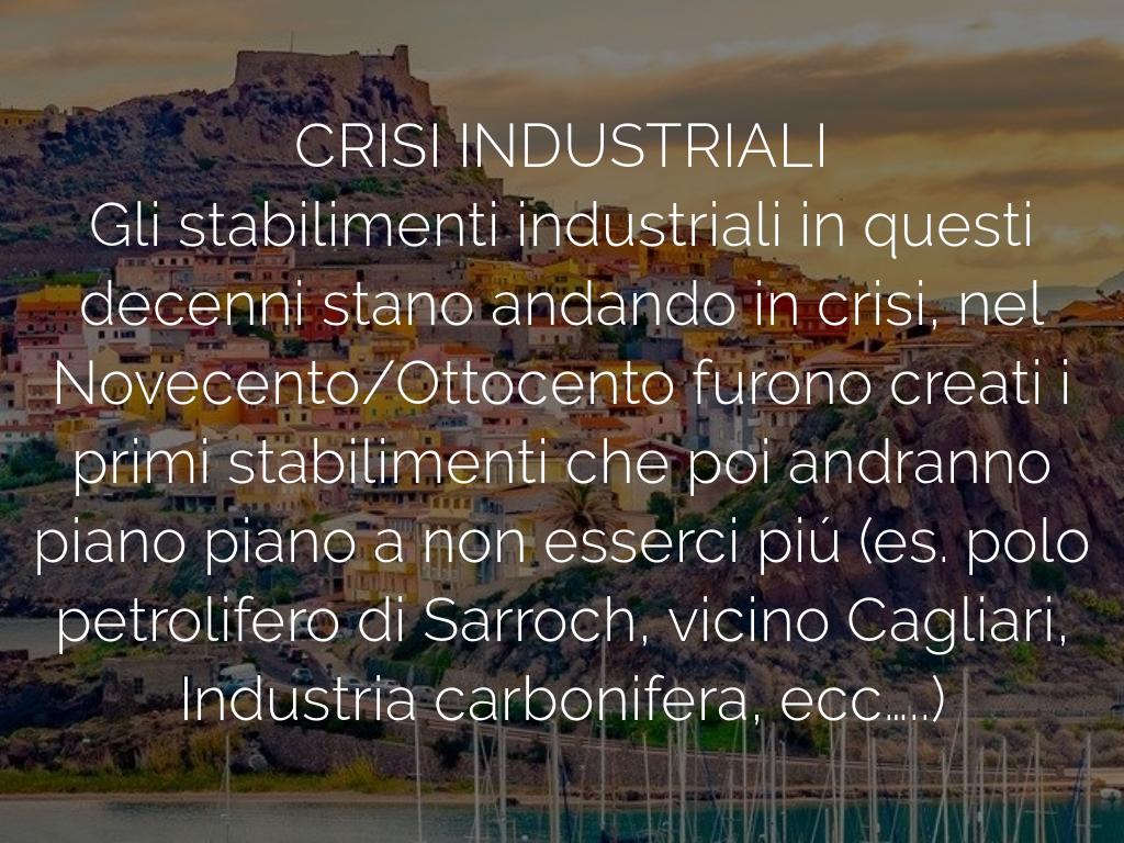 Gli stabilimenti industriali in questi decenni stano andando in crisi, nel Novecento/Ottocento furono creati i primi stabilimenti che poi andranno piano piano a non esserci piú (es. polo petrolifero di Sarroch, vicino Cagliari, Industria carbonifera, ecc…..)
