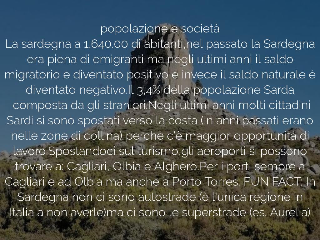 La sardegna a 1.640.00 di abitanti,nel passato la Sardegna era piena di emigranti ma negli ultimi anni il saldo migratorio e diventato positivo e invece il saldo naturale è diventato negativo.Il 3,4% della popolazione Sarda composta da gli stranieri.Negli ultimi anni molti cittadini Sardi si sono spostati verso la costa (in anni passati erano nelle zone di collina) perchè c'è maggior opportunità di lavoro.Spostandoci sul turismo,gli aeroporti si possono trovare a: Cagliari, Olbia e Alghero.Per i porti sempre a Cagliari e ad Olbia ma anche a Porto Torres. FUN FACT: In Sardegna non ci sono autostrade (è l'unica regione in Italia a non averle)ma ci sono le superstrade (es. Aurelia)