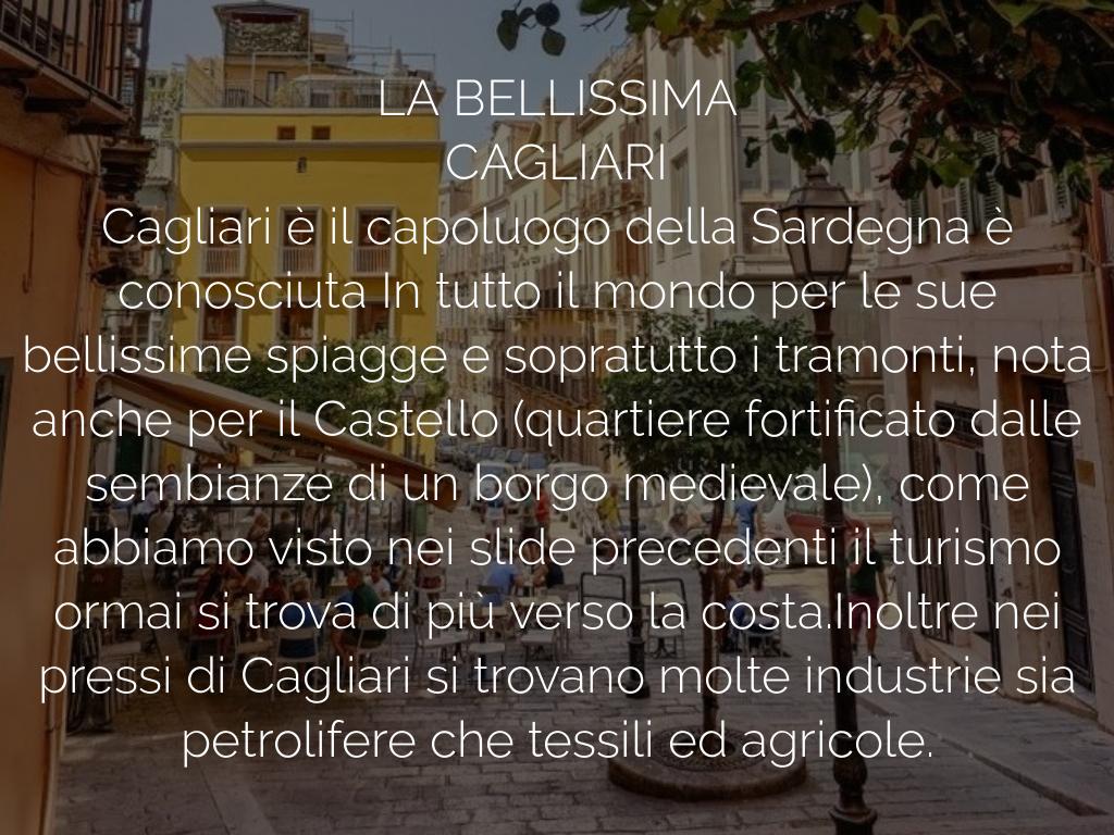 Cagliari è il capoluogo della Sardegna è conosciuta In tutto il mondo per le sue bellissime spiagge e sopratutto i tramonti, nota anche per il Castello (quartiere fortificato dalle sembianze di un borgo medievale), come abbiamo visto nei slide precedenti il turismo ormai si trova di più verso la costa.Inoltre nei pressi di Cagliari si trovano molte industrie sia petrolifere che tessili ed agricole.