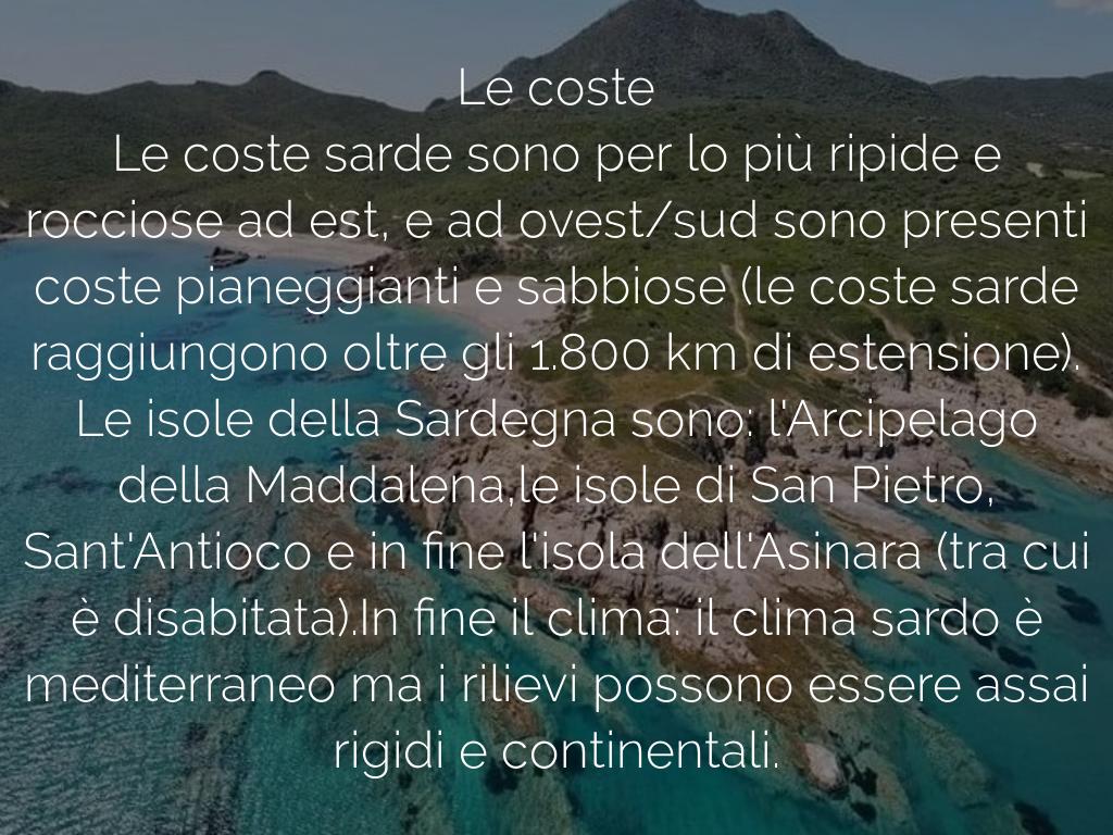 Le isole della Sardegna sono: l'Arcipelago della Maddalena,le isole di San Pietro, Sant'Antioco e in fine l'isola dell'Asinara (tra cui è disabitata).In fine il clima: il clima sardo è mediterraneo ma i rilievi possono essere assai rigidi e continentali.