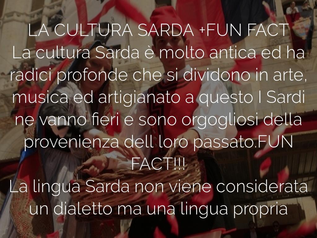 La cultura Sarda è molto antica ed ha radici profonde che si dividono in arte, musica ed artigianato a questo I Sardi ne vanno fieri e sono orgogliosi della provenienza dell loro passato.FUN FACT!!!
