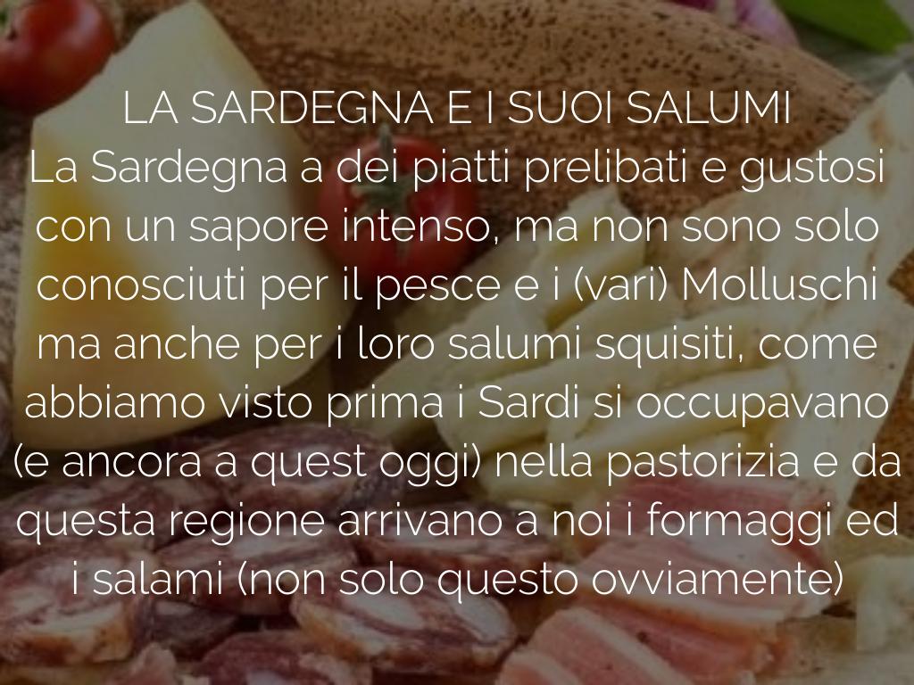 La Sardegna a dei piatti prelibati e gustosi con un sapore intenso, ma non sono solo conosciuti per il pesce e i (vari) Molluschi ma anche per i loro salumi squisiti, come abbiamo visto prima i Sardi si occupavano (e ancora a quest oggi) nella pastorizia e da questa regione arrivano a noi i formaggi ed i salami (non solo questo ovviamente)