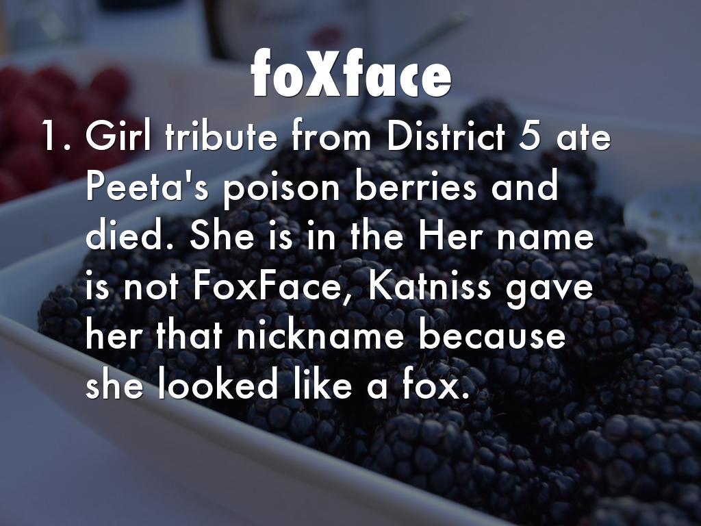 Girl tribute from District 5 ate Peeta's poison berries and died. She is in the Her name is not FoxFace, Katniss gave her that nickname because she looked like a fox.