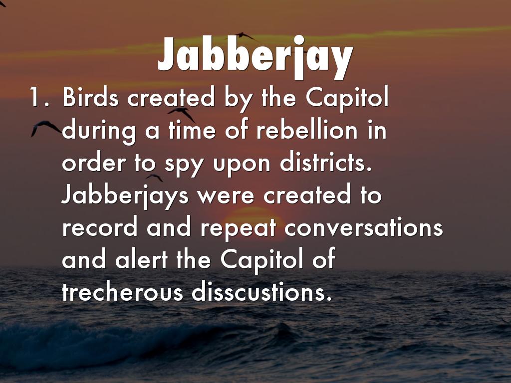 Birds created by the Capitol during a time of rebellion in order to spy upon districts. Jabberjays were created to record and repeat conversations and alert the Capitol of trecherous disscustions.