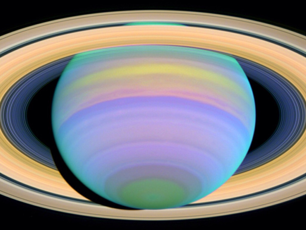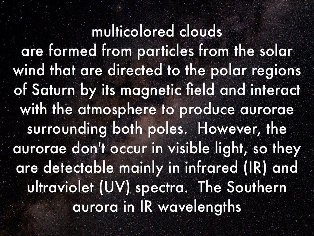 multicolored clouds are formed from particles from the solar wind that are directed to the polar regions of Saturn by its magnetic field and interact with the atmosphere to produce aurorae surrounding both poles. However, the aurorae don't occur in visible light, so they are detectable mainly in infrared (IR) and ultraviolet (UV) spectra. The Southern aurora in IR wavelengths