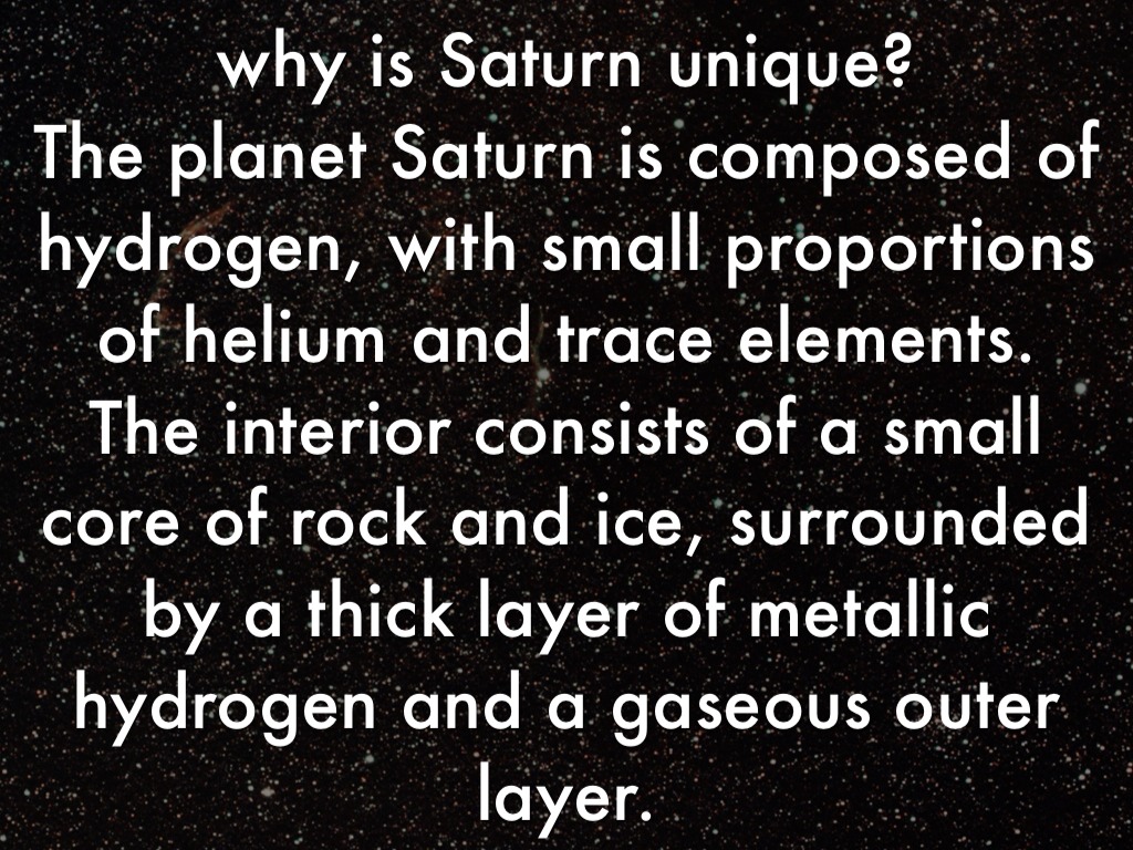 why is Saturn unique? The planet Saturn is composed of hydrogen, with small proportions of helium and trace elements. The interior consists of a small core of rock and ice, surrounded by a thick layer of metallic hydrogen and a gaseous outer layer.