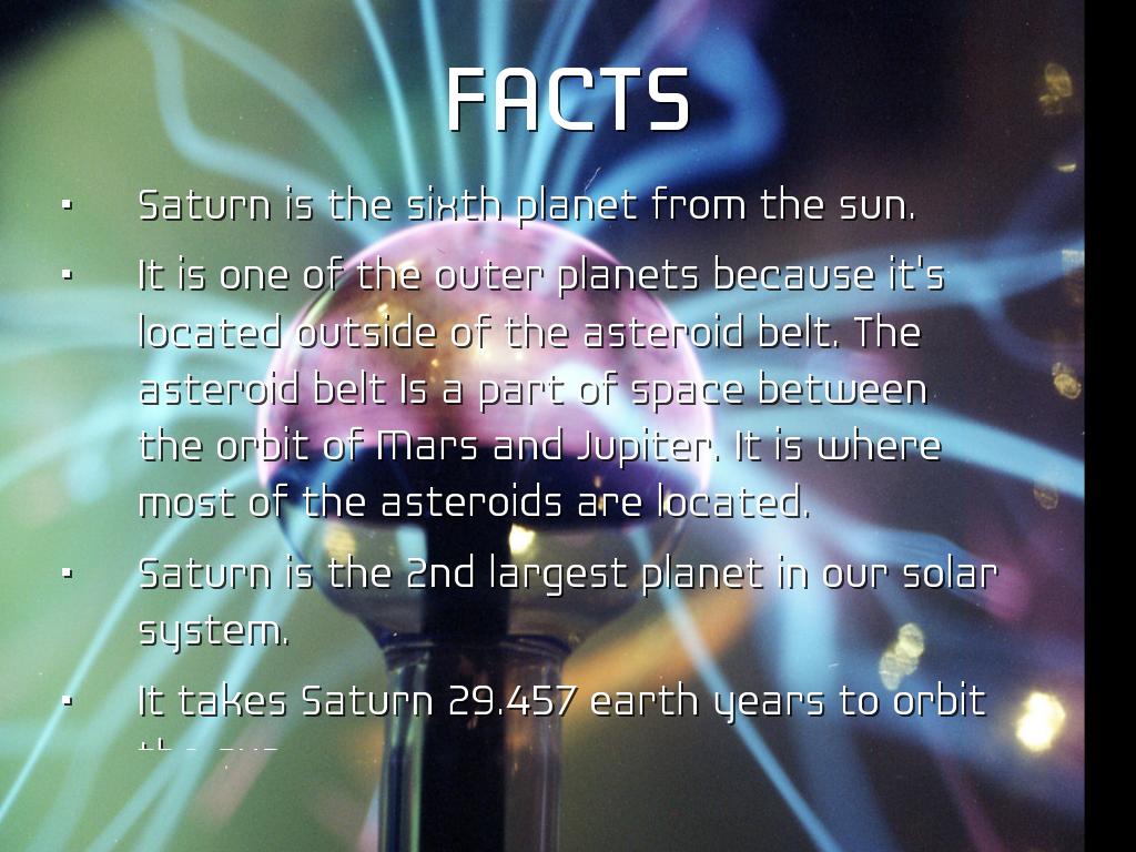 • It takes Saturn 29.457 earth years to orbit the sun.